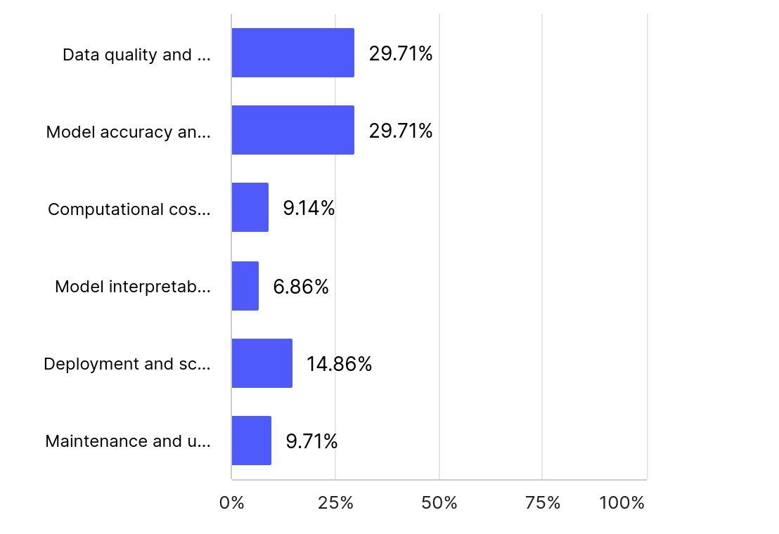 - Data quality and availability (51%) and model accuracy and performance (46%) were reported to be the biggest areas of concern for respondents, with scalability coming in third.