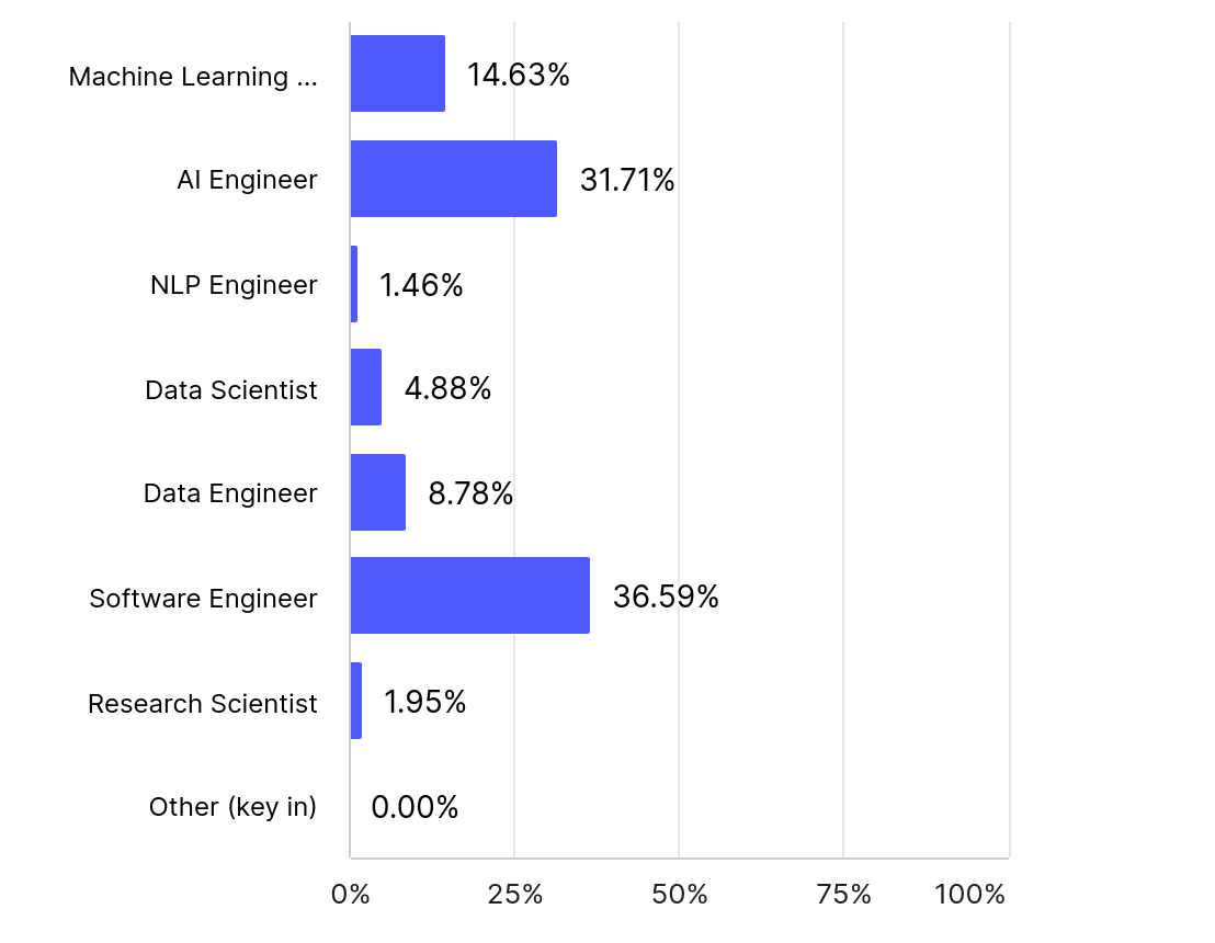 - Roughly a third of the respondents identified as "AI engineers," while another third held the title of "Software engineer." Only 15% identified of the respondents identified as “Machine Learning engineers,” indicating that software engineering jobs are increasingly beginning to include machine learning work.